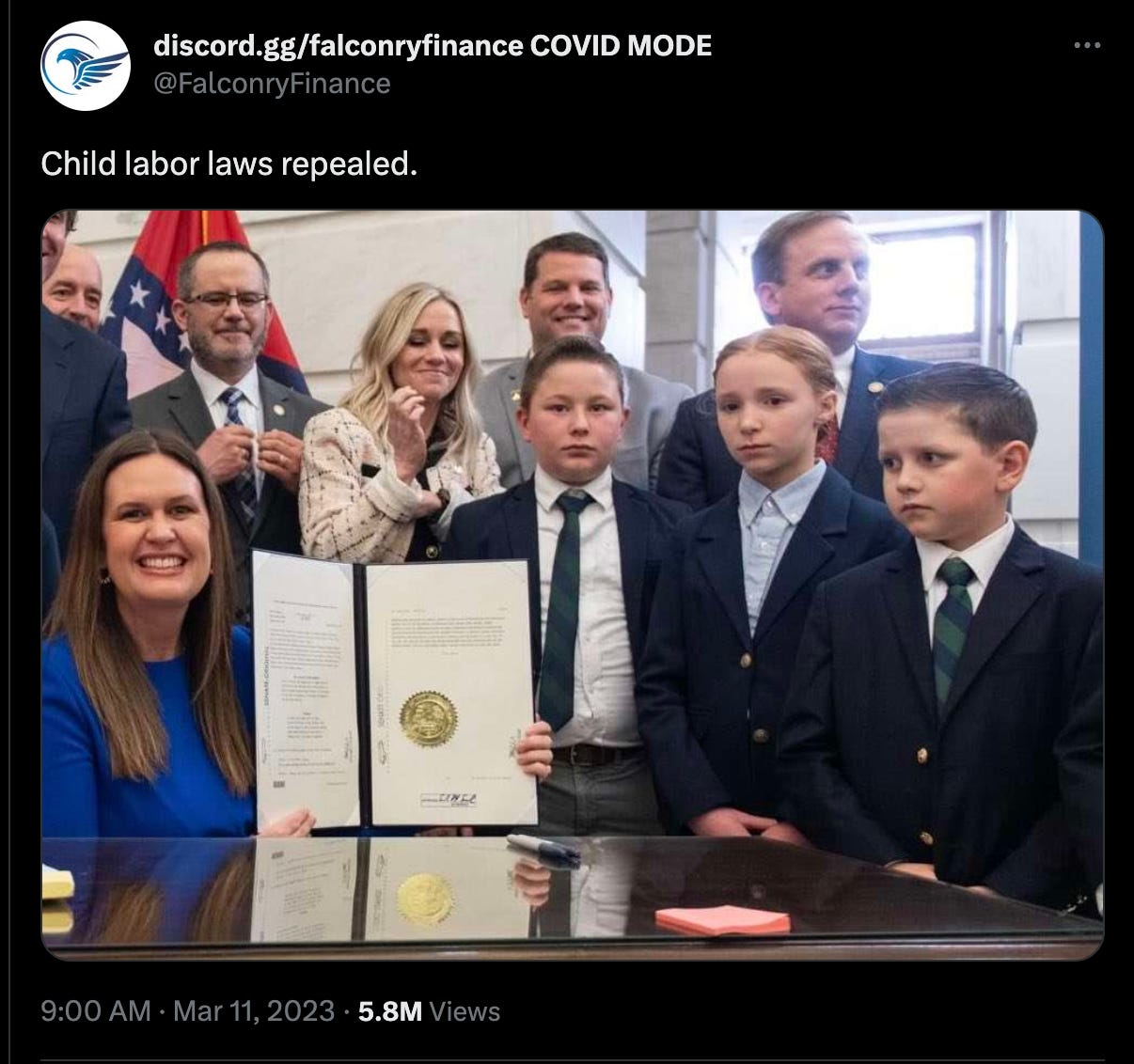 Among those who criticize levels of covid precaution, goes criticism of child labor protections. The message being, business as usual even if it is built on the backs of unvaccinated children. Indeed, we saw rhetoric arguing that unvaccinated children had roughly equivalent rates of harm from Covid to the vaccinated grandparents, therefore behaving as if there were no such pathogen did not present any moral disservice to the children. After all, vaccinated elderly were opting to enjoy themselves, why not make an executive decision to opt little Timmy into a bit of acceptable risk on his behalf?