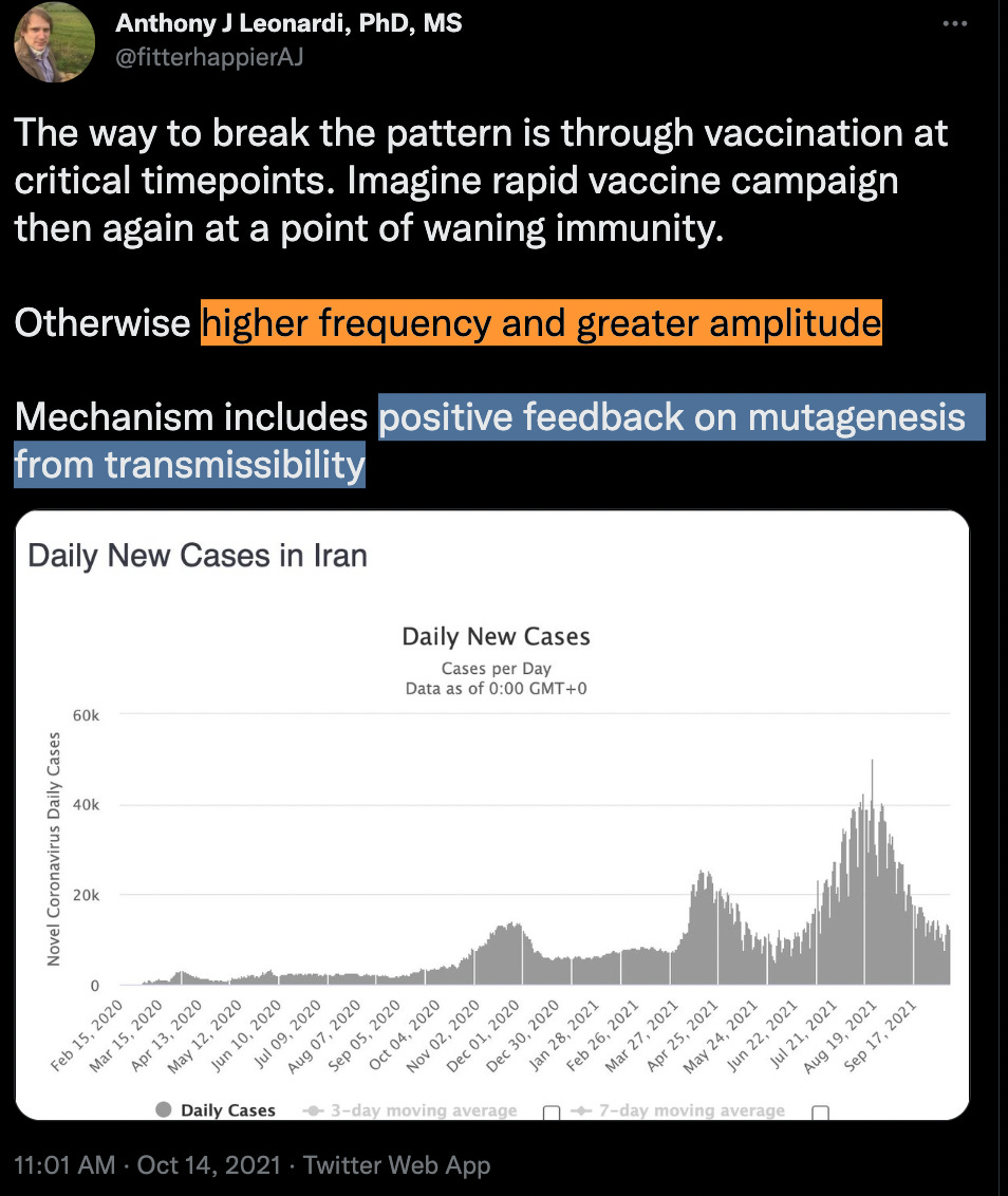 Long before Omicron was deemed the most rapidly transmitting virus in human history, I described a positive feedback loop between the rate of evolution and transmissibility, with the potential for increases in transmissibility due to several micro, macro, viral, and host factors that would accelerate this process. These factors manifest greater synchrony and therefore amplitude of waves from increased travel due to lessened travel restrictions (which would increase the number of humans a single person contacts and therefore R), greater Ace2 affinity of Spike, and greater amount of infections per unit time. In turn, this greater amount of infections from these advantages would accelerate evolution, making waves have greater amplitude and frequency.